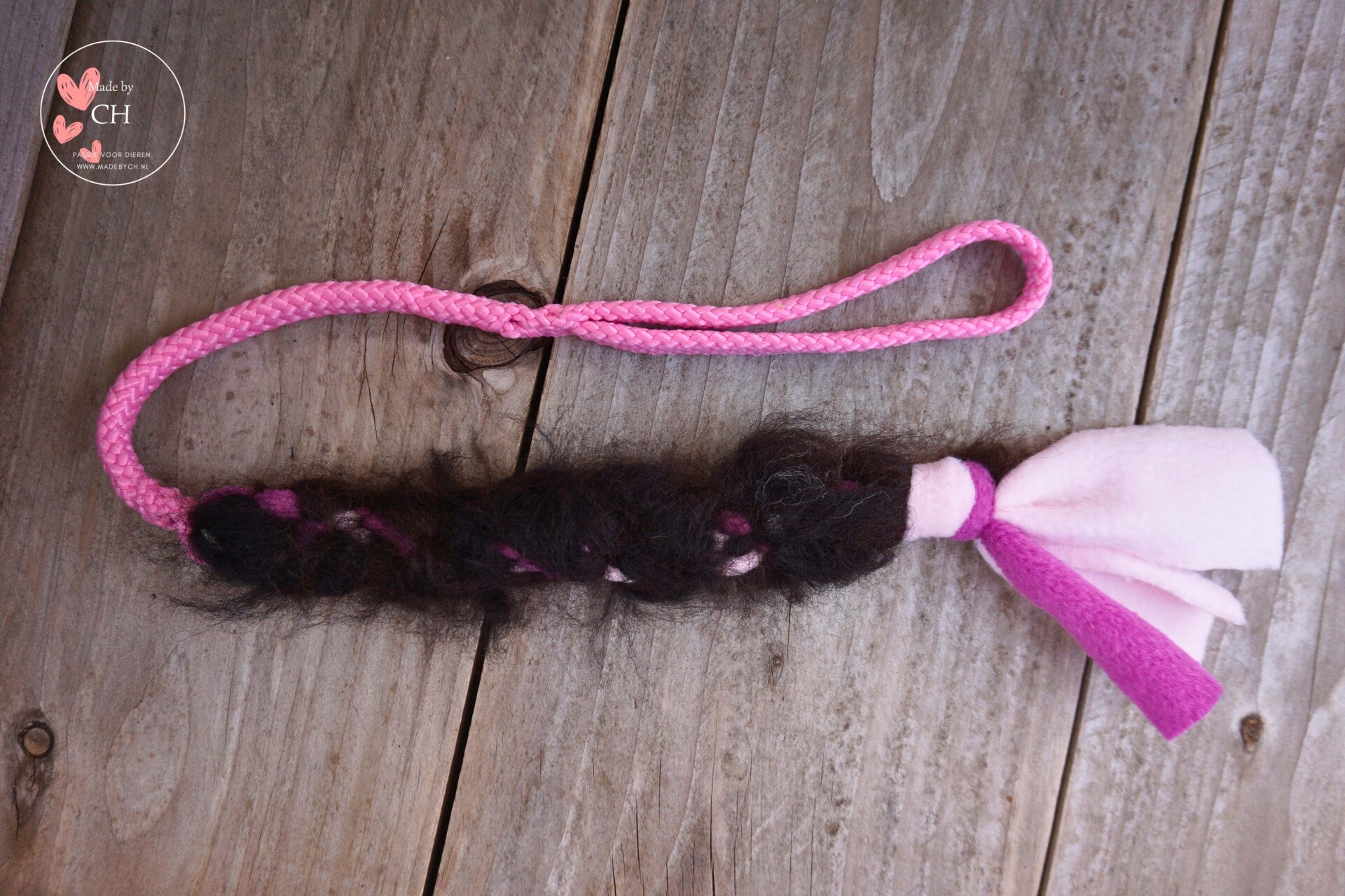 Tug voor kleine honden. Gemaakt van 8 mm dik PPM touw in de kleur roze met fleece in de kleuren cassis en lichtroze. In deze tug is donderbruine schapenvacht verwerkt. Deze tug is geknoopt en daardoor extra sterk.