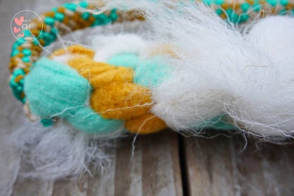 Tug in de kleuren mintgroen en oker. De tug is gemaakt van 8 mm dik PPM touw in de kleuren mintgroen, oker en beige en fleece in de kleuren mintgroen en oker. PPM touw 8 mm is vooral geschikt voor kleine tot middelgrote honden. In deze tug is witte schapenvacht verwerkt.