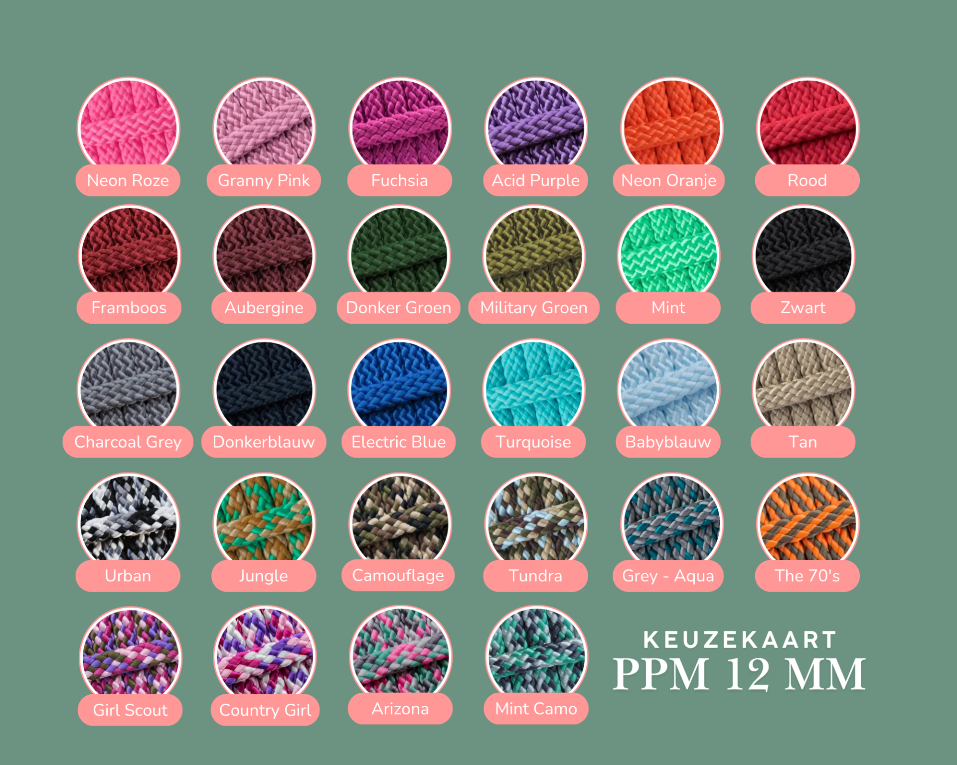 PPM-touw is een stevig en waterafstotend product dat veilig is voor je hond. We zetten het touw van je tug zorgvuldig in elkaar, zodat het risico dat je tug tijdens het spelen kapot gaat, heel klein is. Onze Bungeetugs voor Boeven en Krachtpatsers worden met 12mm dik PPM-touw gemaakt. Je kunt kiezen uit ruim 20 kleuren PPM-touw.